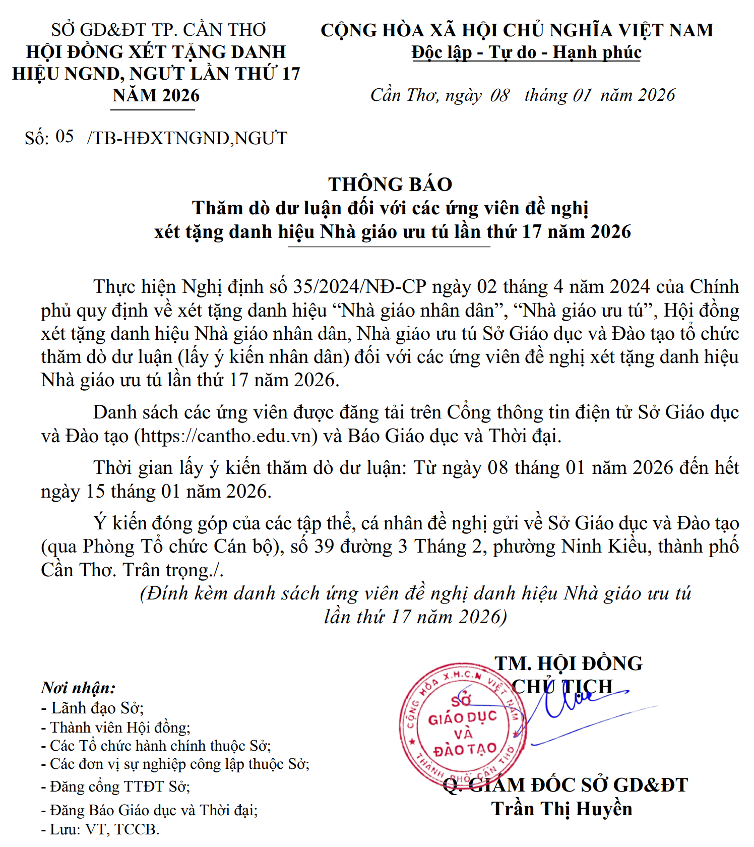 Danh sách các ứng viên được đăng tải trên Cổng thông tin điện tử Sở Giáo dục và Đào tạo (https://cantho.edu.vn), Báo Giáo dục và Thời đại, hoặc xem chi tiết trong file đính kèm